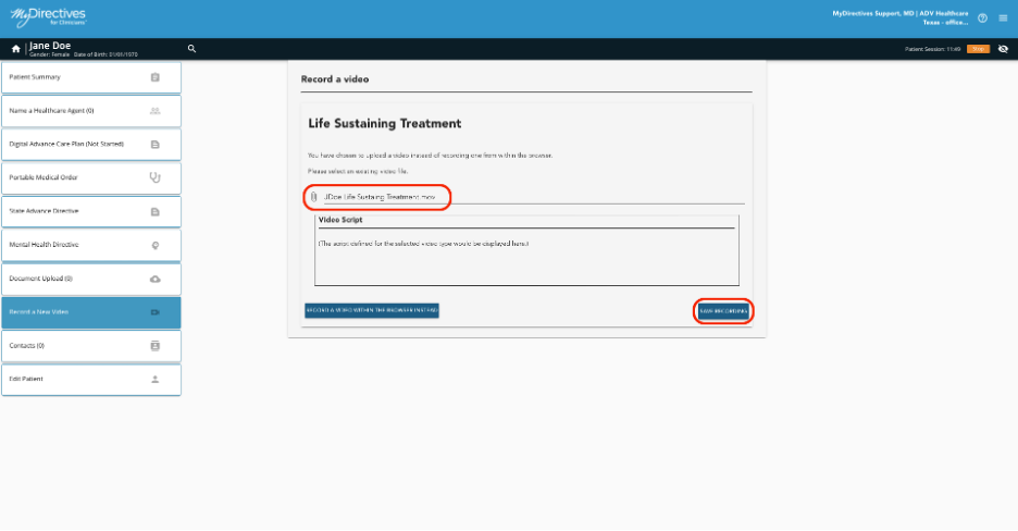 To upload a pre-recorded video to a patient’s account, click Record a New Video in the left-hand navigation menu.
